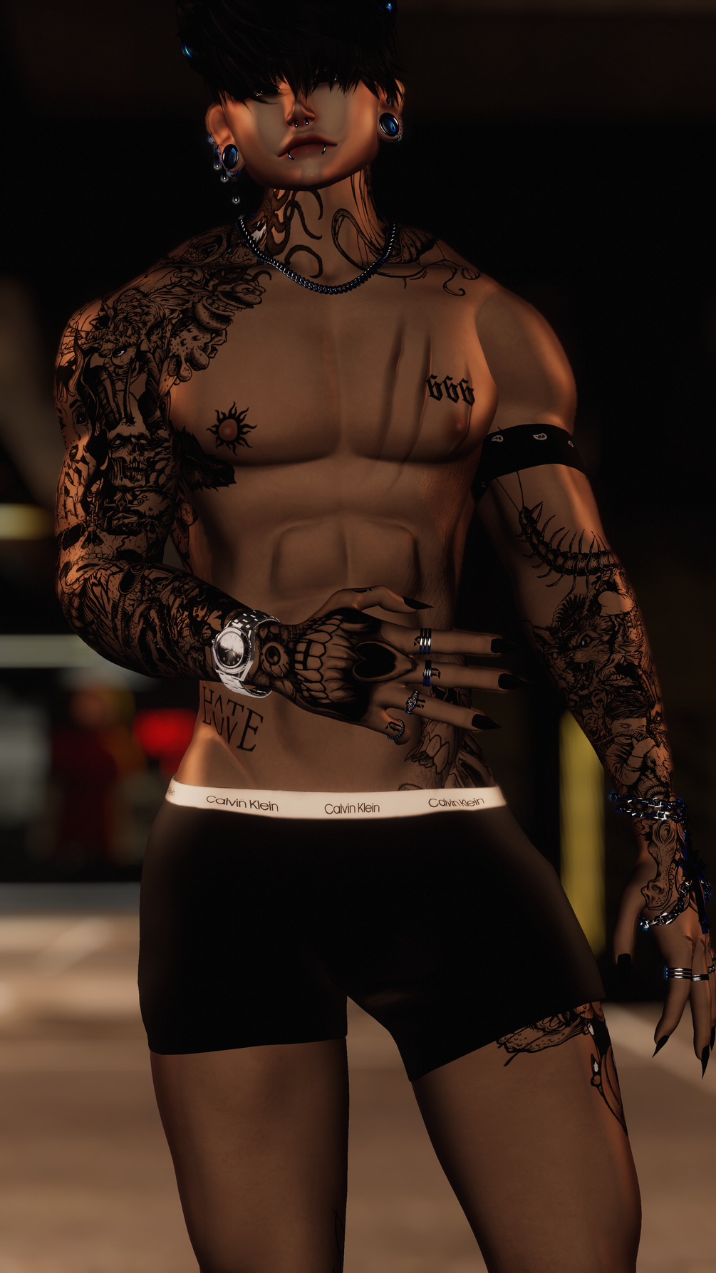 ♡ INCLUDED IN PACKAGE texture maps: (body) body with layered tattoos , 4 Emissions map, 2 Normal maps, 1 unity package with custom settings.